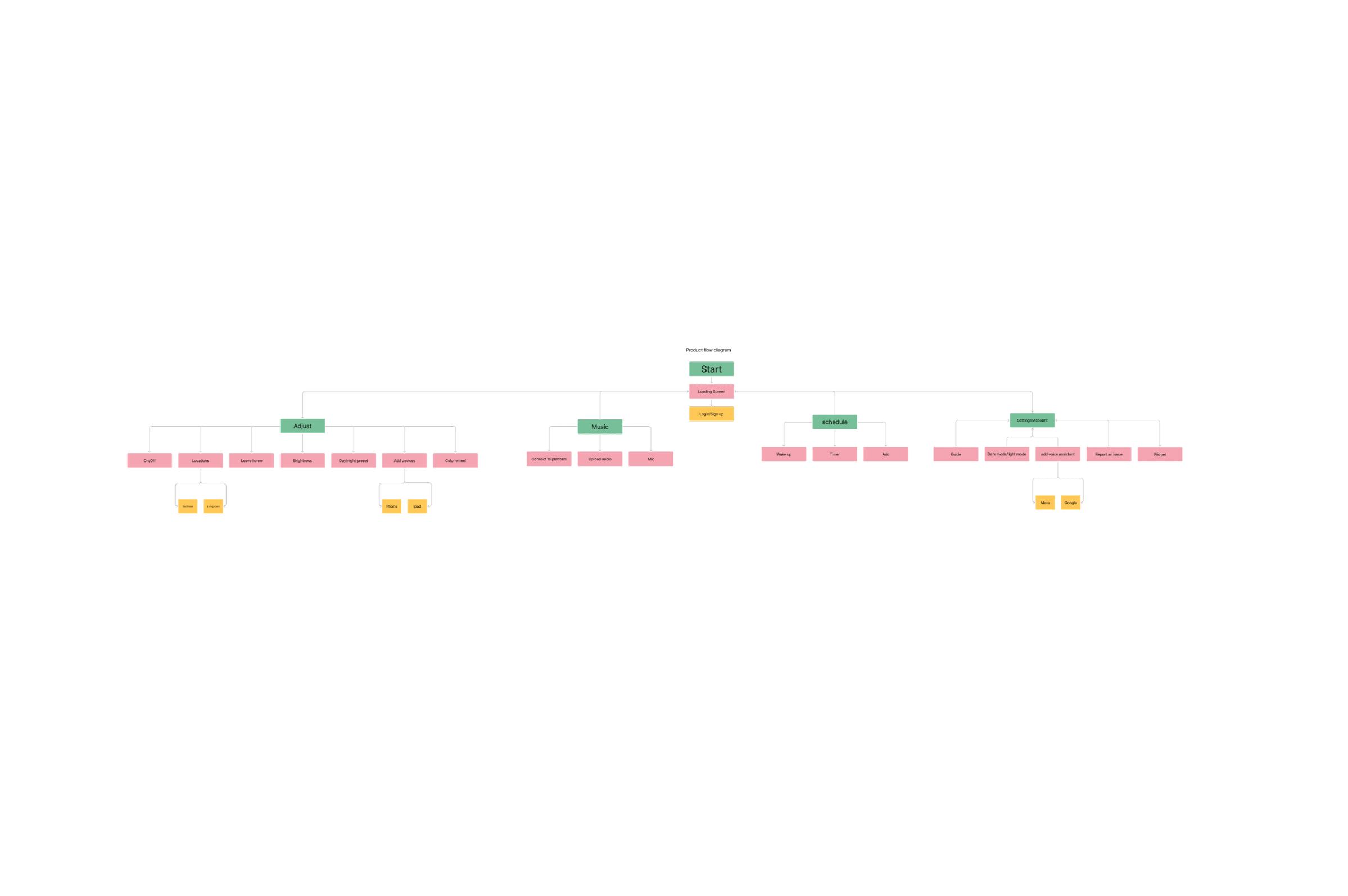 The user flow diagram illustrates how users navigate through the app, from logging in or signing up and accessing the home dashboard to customizing lighting settings and saving preferred modes. It maps out the login and music sync proccess of the app.