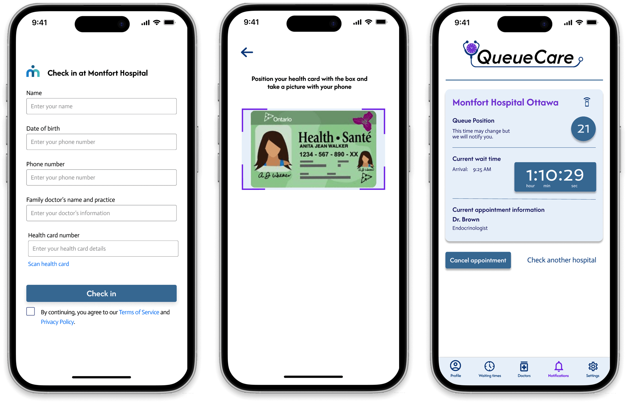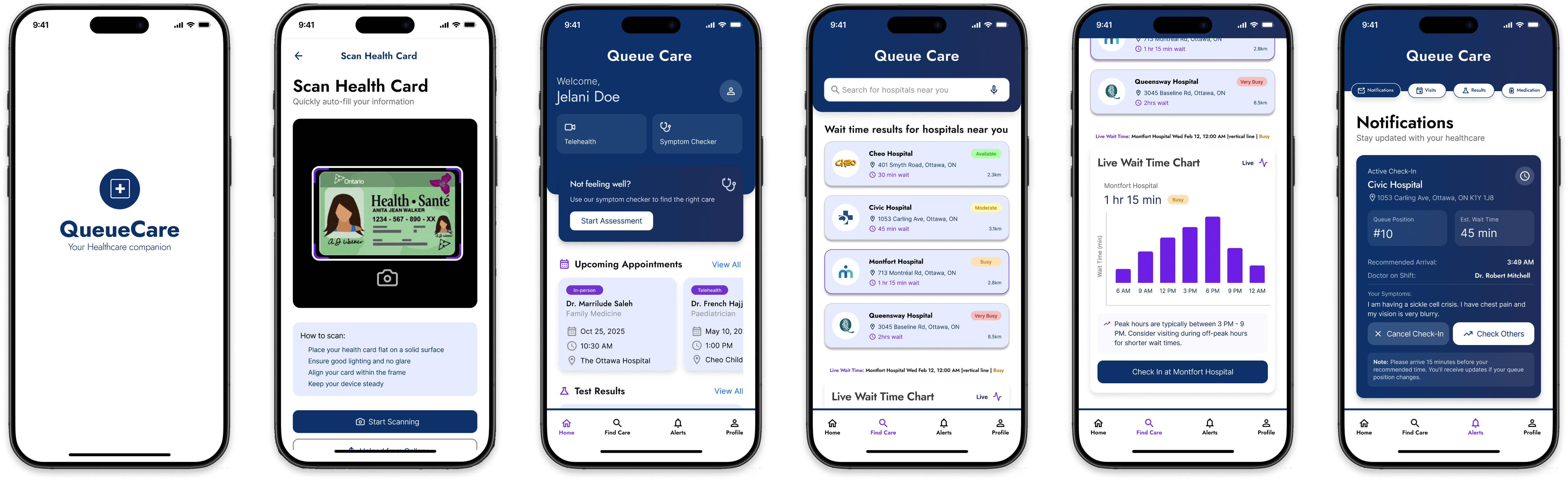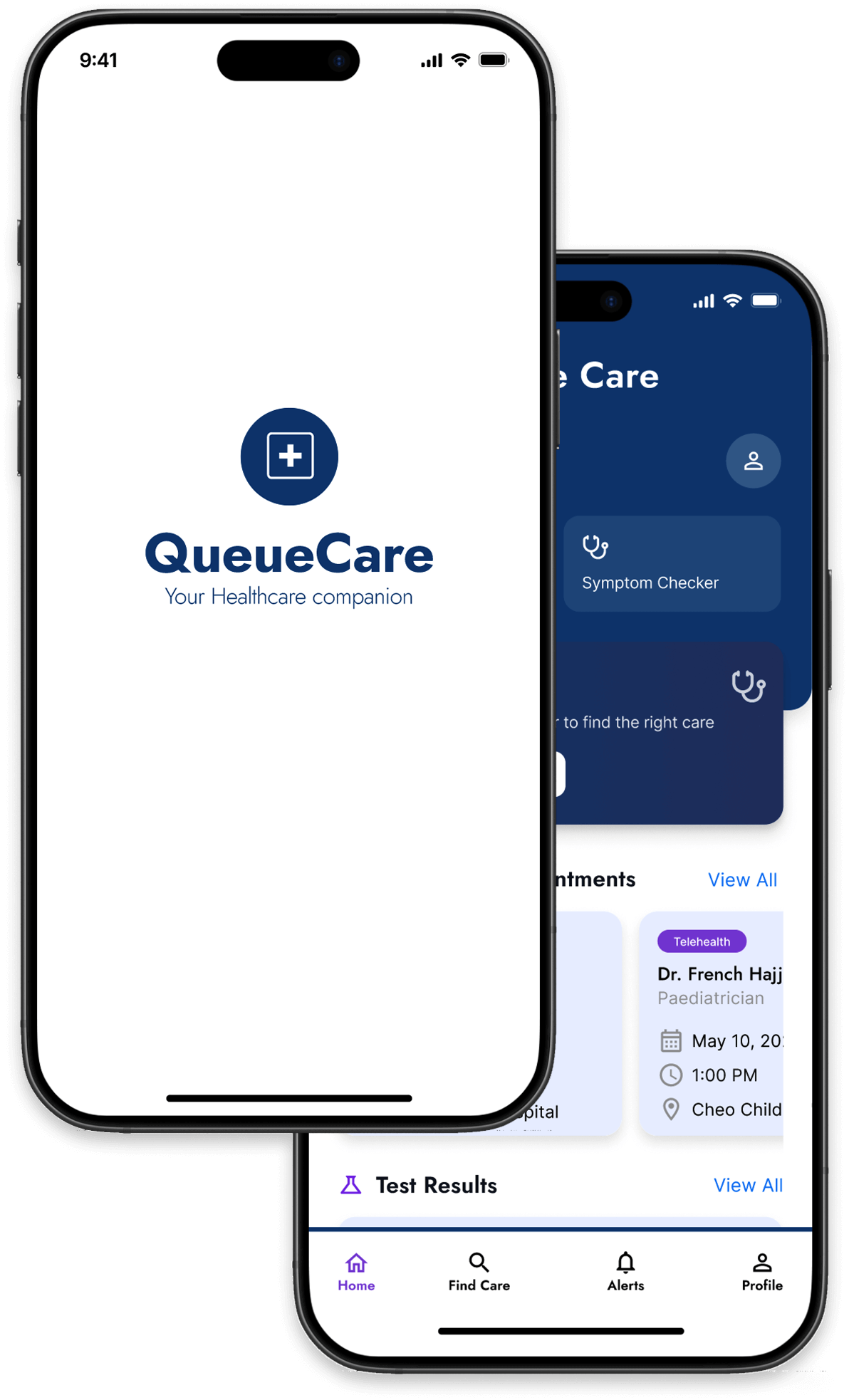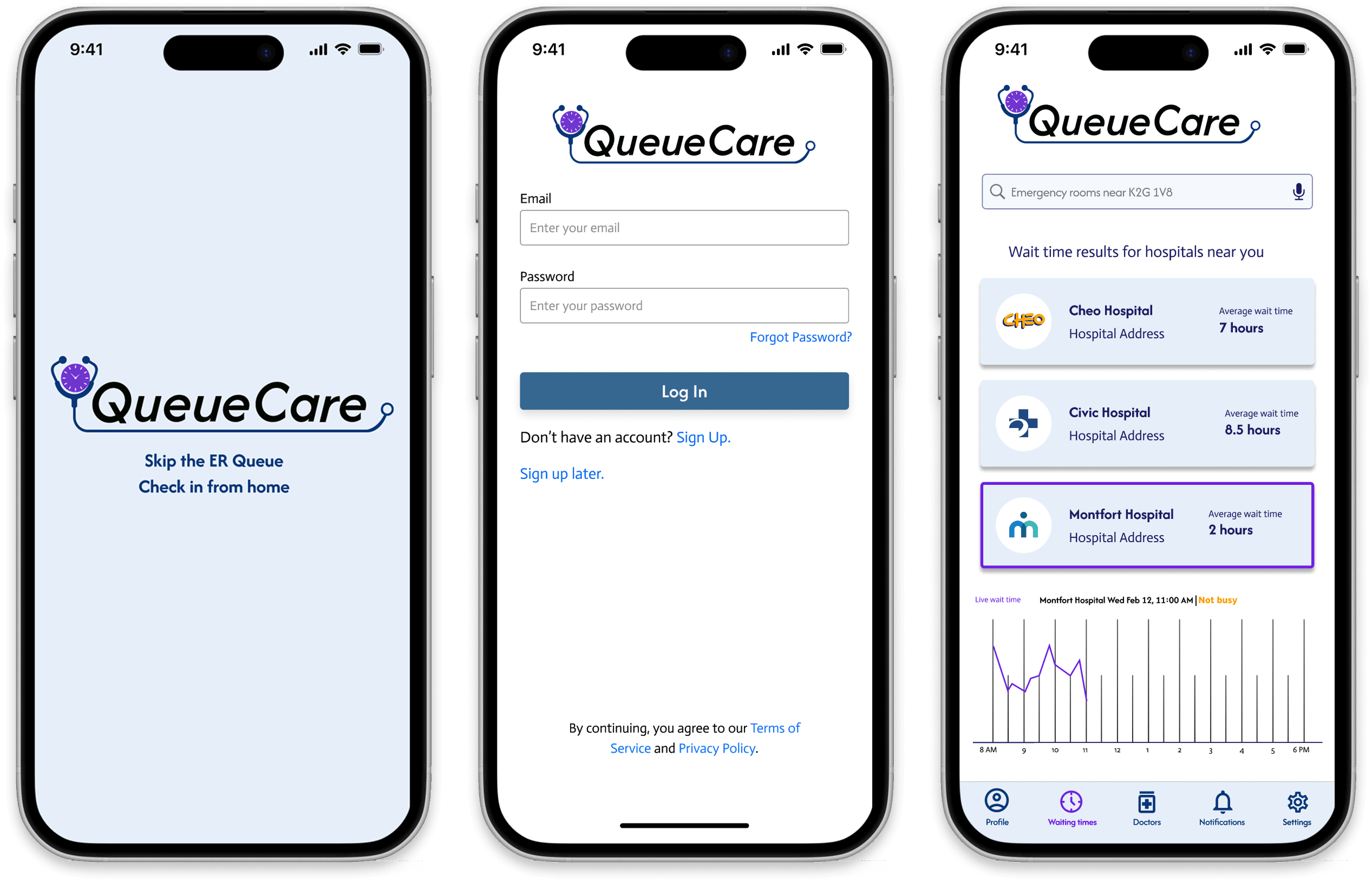 Queue Care is designed help Ontario residents navigate the healthcare system by providing real-time ER and urgent care wait times. It reduces patient frustration by offering queue tracking, live delay notifications, and digital pre-registration for faster check-ins. A built-in symptom checker guides users on whether to visit the ER, a clinic, or use Telehealth services.