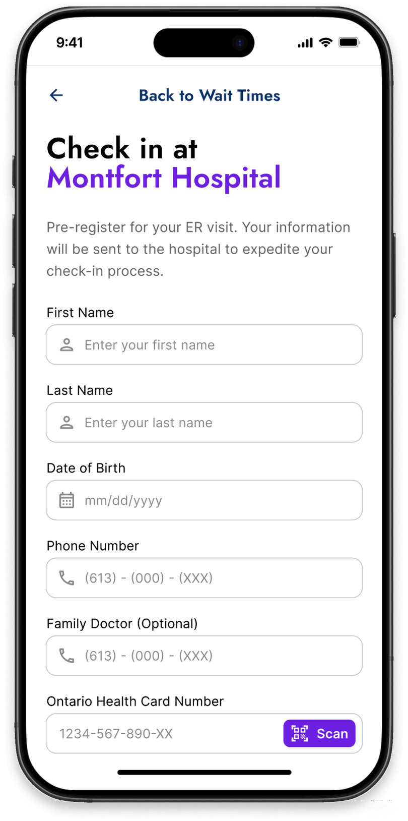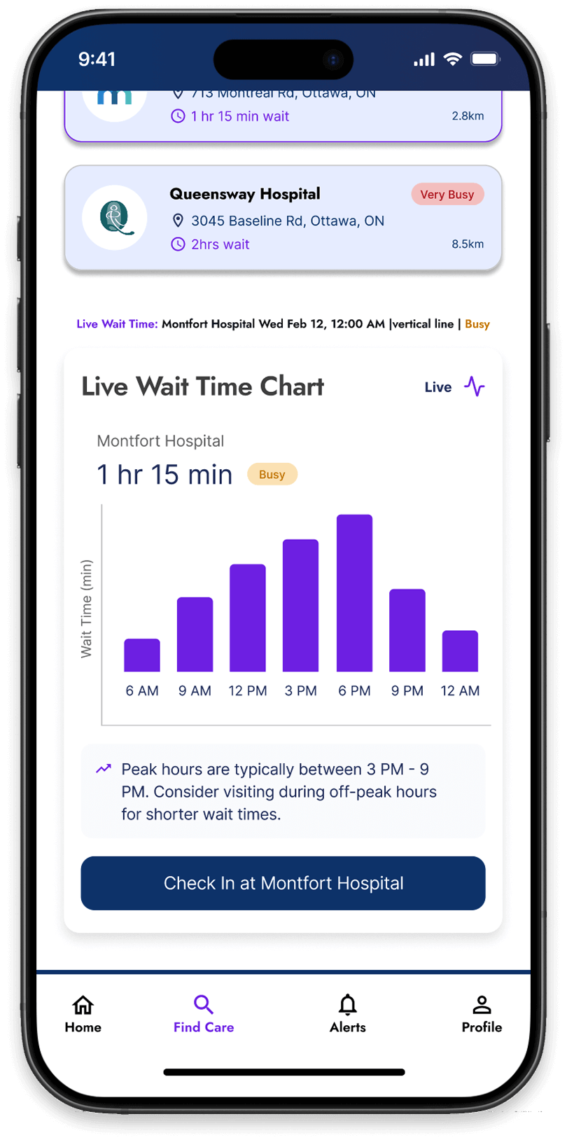 The Canadian government provides free healthcare; however, Canadians often face long wait times in return. Many patients without a family doctor or access to walk-in clinics turn to emergency rooms, often without knowing how long they’ll have to wait. As a result, they spend hours in uncertainty, without real-time updates leading to frustration, stress, and unnecessary ER visits for non-urgent cases. To reduce overcrowding and enhance the patient experience, hospitals need a transparent system that offers real-time wait-time updates and helps patients make informed decisions about where to seek care.